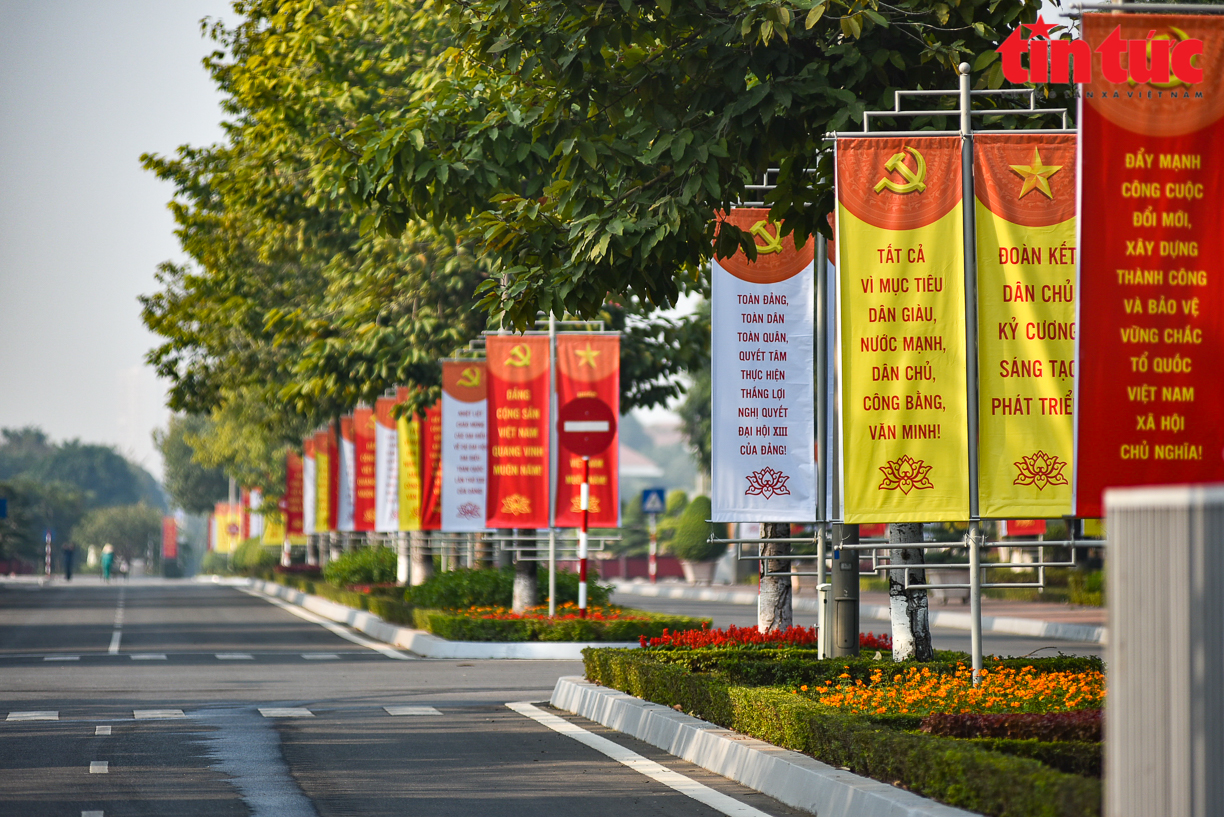 Cờ đỏ sao vàng, cờ búa liềm rực rỡ quanh khu diễn ra Đại hội.