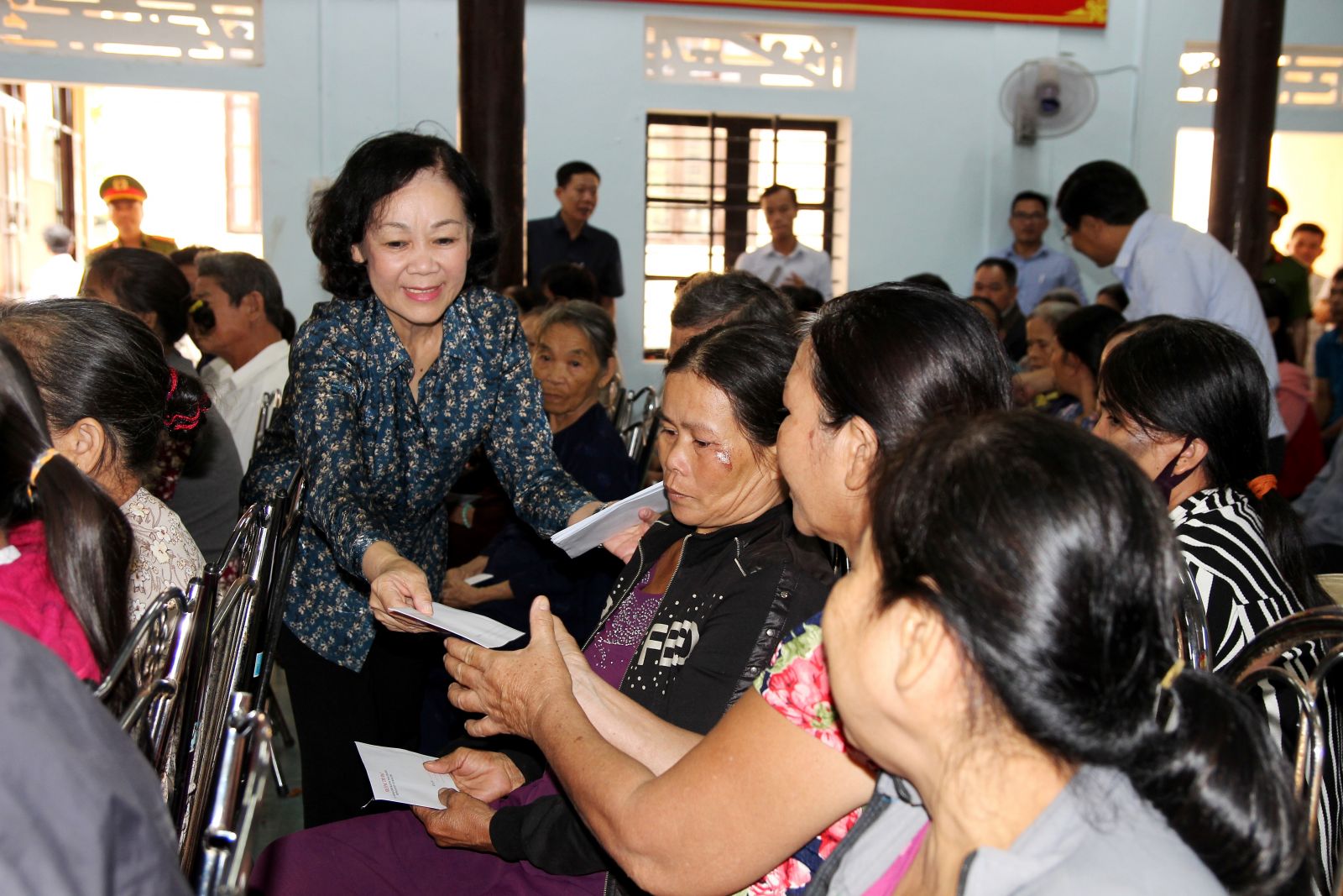 Sau khi làm việc với tỉnh, Trưởng ban Dân vận Trung ương Trương Thị Mai và Bí thư Tỉnh ủy Lê Trường Lưu cùng các sở, ban, ngành của tỉnh đã đến thăm, chia sẻ với 100 người dân bị thiệt hại nặng do bão lũ gây ra ở phường Hương Văn và Hương Vân (TX. Hương Trà); tặng quà, chia sẻ khó khăn với lãnh đạo tỉnh và một số người dân có nhiều nỗ lực trong ứng cứu bão lũ trên địa bàn tỉnh.