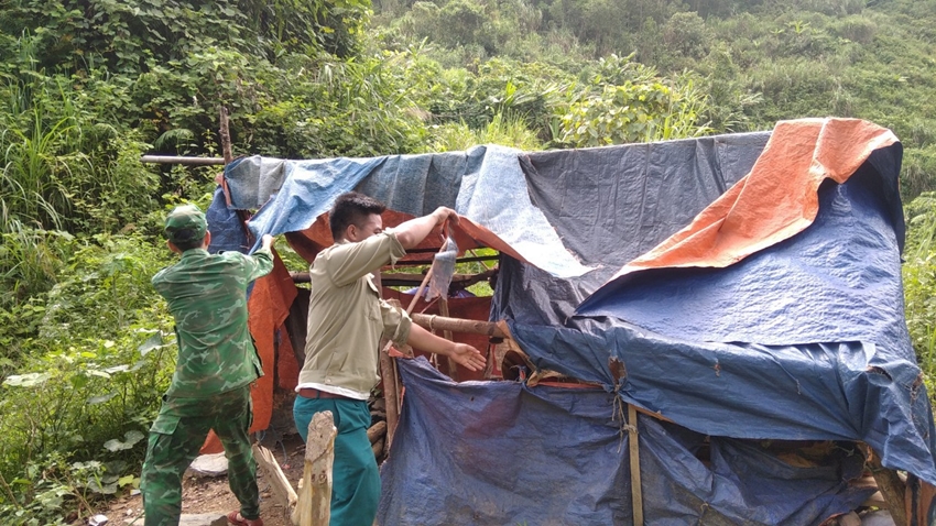 Đoàn liên ngành còn phát hiện một lán trại của người dân khai thác vàng sa khoáng trái phép để lại, có chứa các vật dụng, xoong nồi, quần áo và các dụng cụ để khai thác vàng gồm khay để đãi vàng, xe rùa, cuốc, xẻng, ống nước cao su khoảng 30 mét dùng để lấy nước đãi vàng.