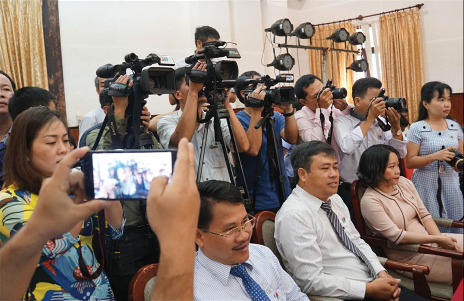 Tác nghiệp tại Hội thảo báo Đảng các tỉnh khu vực miền Trung - Tây Nguyên năm 2019. Ảnh: HL