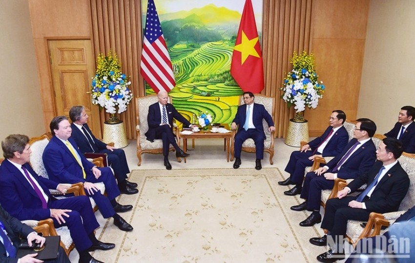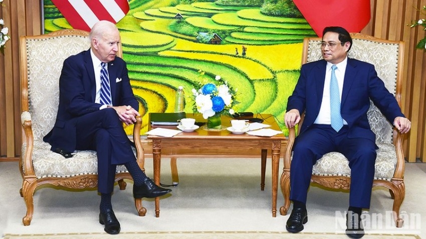 Tại cuộc hội kiến, Thủ tướng Chính phủ Phạm Minh Chính chào mừng Tổng thống Joe Biden và Đoàn đại biểu cấp cao Hoa Kỳ tới thăm Việt Nam đúng vào dịp kỷ niệm 10 năm xác lập khuôn khổ Đối tác toàn diện, nhấn mạnh ý nghĩa quan trọng của việc Tổng Bí thư Nguyễn Phú Trọng và Tổng thống Joe Biden tuyên bố nâng cấp quan hệ Việt Nam-Hoa Kỳ lên Đối tác chiến lược toàn diện, phản ánh tầm vóc của quan hệ, phù hợp lợi ích của nhân dân hai nước và đóng góp tích cực vào hòa bình, ổn định, hợp tác và phát triển tại khu vực và trên thế giới.