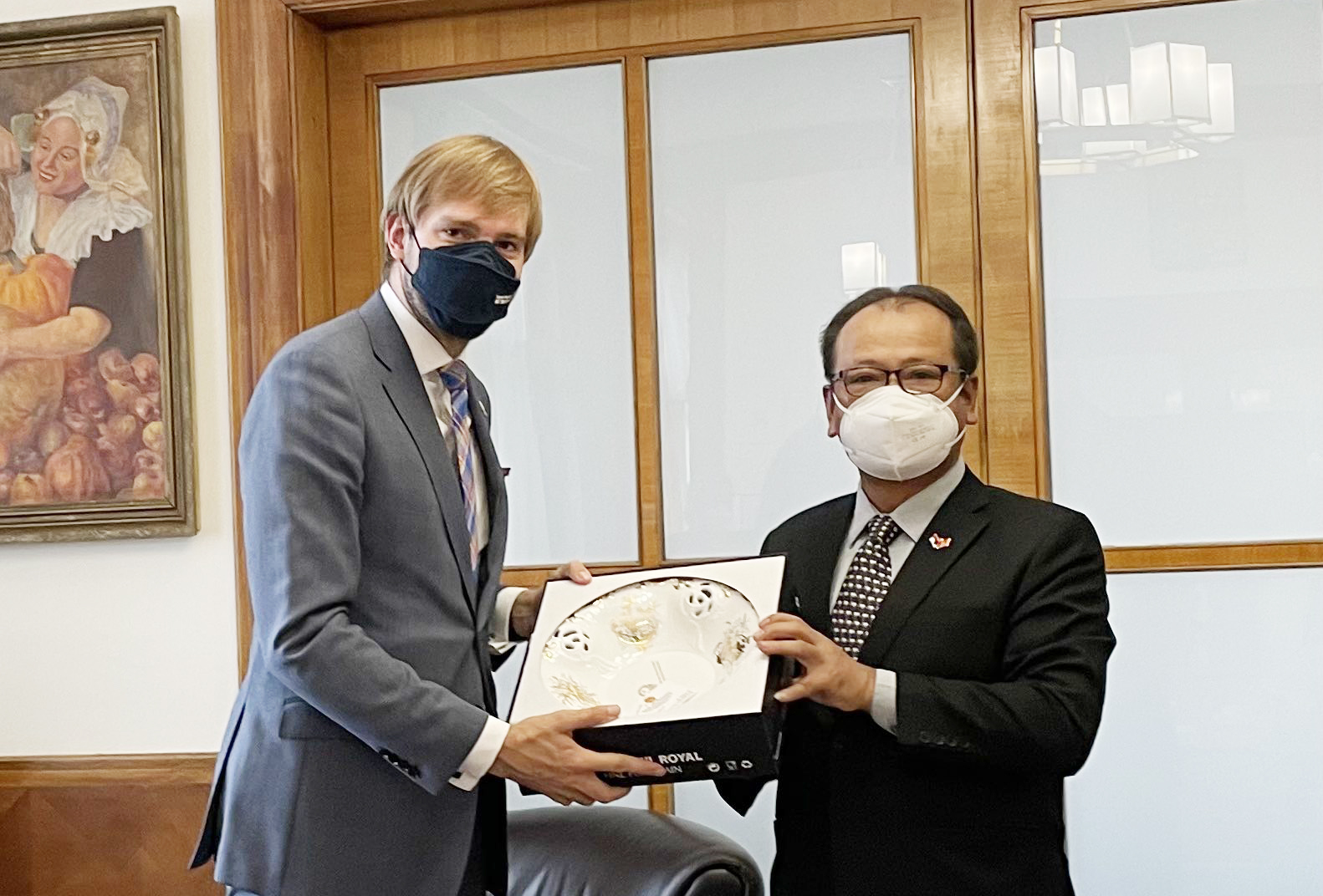 Đại sứ Thái Xuân Dũng tặng quà lưu niệm cho Bộ trưởng Y tế Séc Adam Vojtech. Ảnh: Hoàng Hải