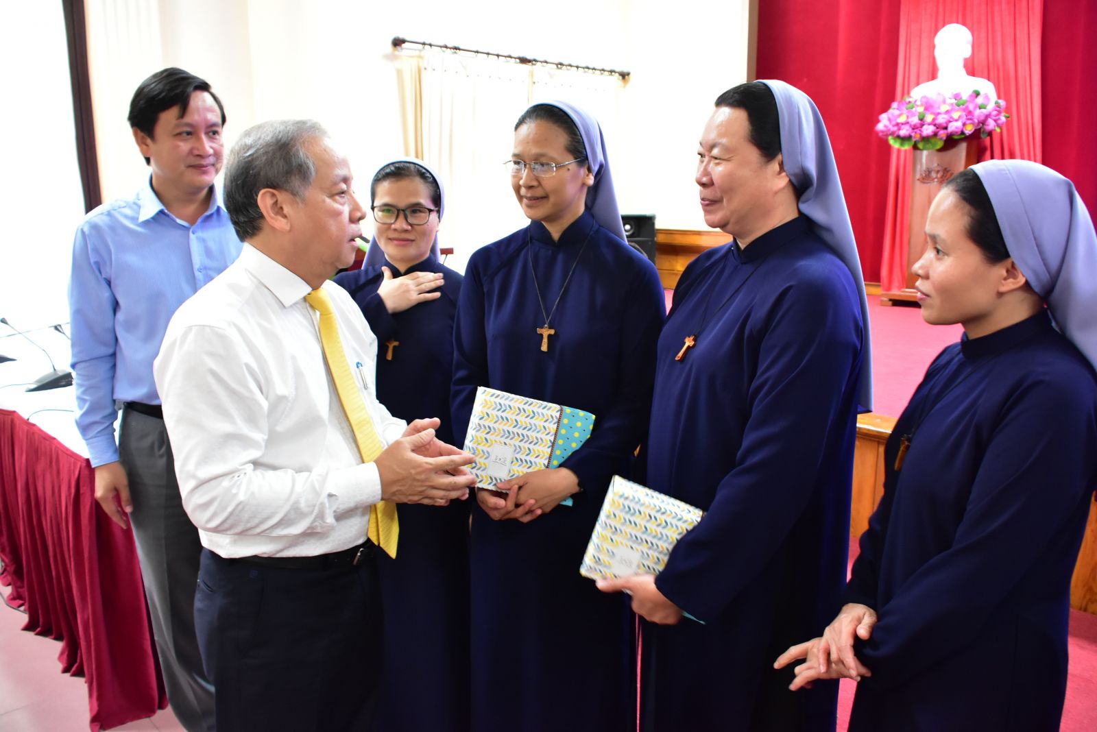 Chủ tịch UBND tỉnh trò chuyện thân mật với các nữ tu về công tác chăm sóc trẻ em khuyết tật