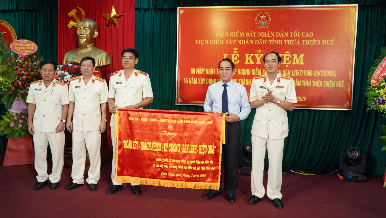 Phó Bí thư Thường trực Tỉnh ủy Bùi Thanh Hà (thứ 2 từ phải qua) thay mặt lãnh đạo tỉnh trao tặng ngành KSND tỉnh bức trướng "Đoàn kết- Trách nhiệm- Kỷ cương- Bản lĩnh- Hiệu quả"