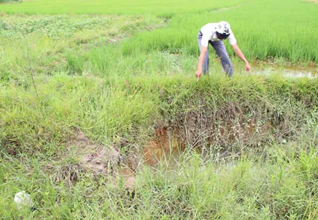 Về tình hình sụt lún, gây mất nước, đoàn kiểm tra cho biết các hố sụt lún xuất hiện từ tháng 6/2014, đến tháng 7/2015 đã ghi nhận có tất cả 35 hố sụt lún tại khu vực đồng ruộng Mỏm Lang thôn Điền Lộc, chạy dọc theo tuyến đê bao số 1.