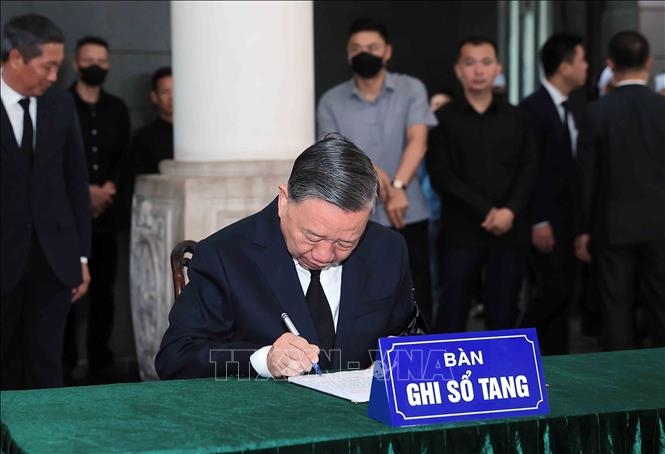 | Tổng Bí thư Tô Lâm ghi sổ tang tại lễ viếng nguyên Chủ tịch nước Trần Đức Lương. Ảnh: TTXVN |