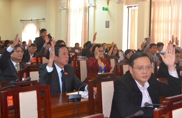 Các đại biểu biểu quyết thông qua nghị quyết tại phiên họp sáng 10/12, kỳ họp thứ 11, HĐND khóa VI, nhiệm kỳ 2011-2016