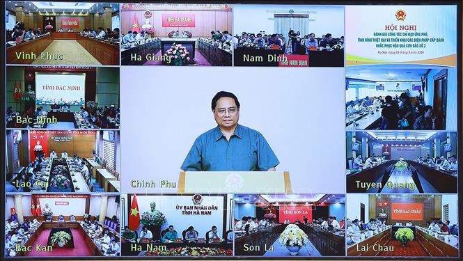 | Thủ tướng Phạm Minh Chính chủ trì hội nghị trực tuyến với các địa phương để đánh giá thiệt hại và khắc phục hậu quả cơn bão số 3. Ảnh: Dương Giang/TTXVN |