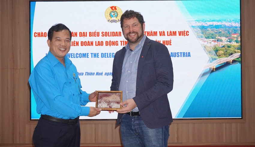| Chủ tịch Liên đoàn Lao động tỉnh Lê Minh Nhân tặng quà lưu niệm cho đoàn đại biểu Solidar - Áo |
