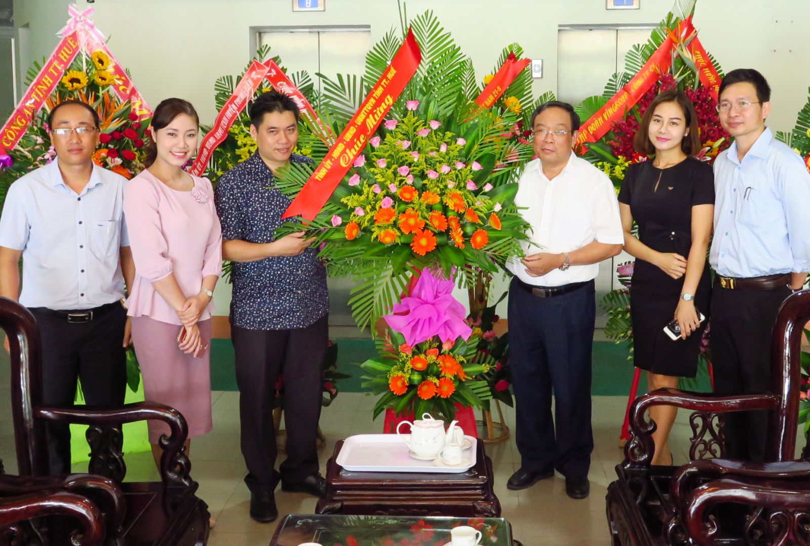 | Chủ tịch UBND tỉnh Nguyễn Văn Cao (thứ 3 từ phải) tặng hoa đơn vị |