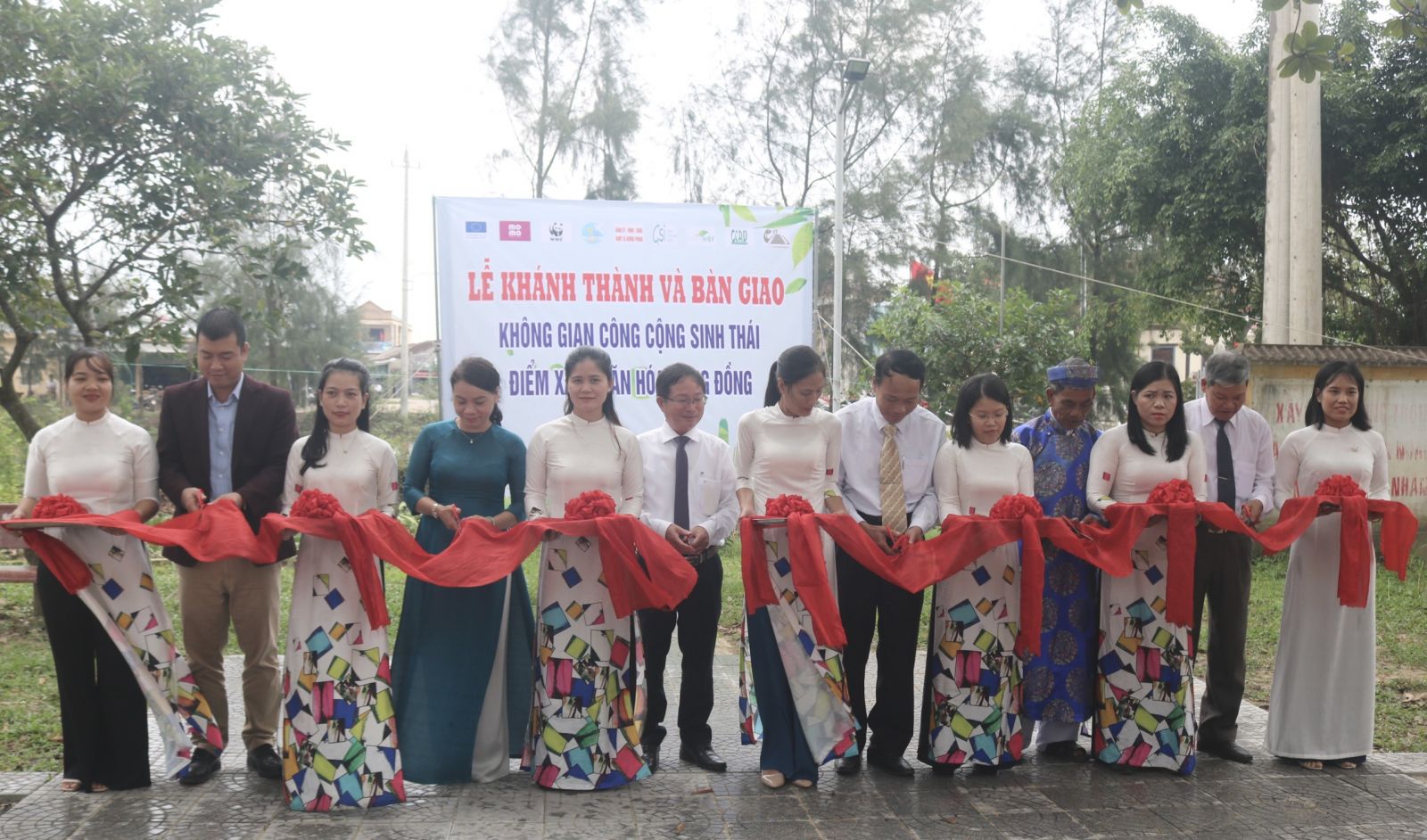 Đại diện lãnh đạo địa phương cùng Trung tâm Nghiên cứu và Phát triển cộng đồng cắt băng khánh thành "Điểm xanh văn hóa"