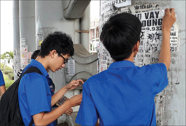 Lực lượng đoàn viên thanh niên phường Thủy Dương ra quân tháo gỡ các quảng cáo, rao vặt dán bừa bãi