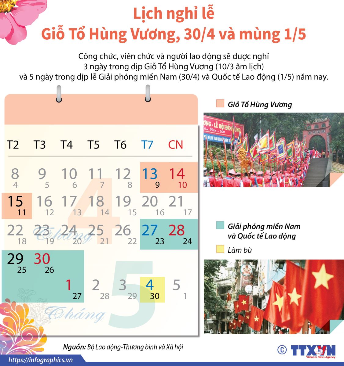 Toàn bộ lịch nghỉ lễ Giỗ Tổ Hùng Vương, 30/4, mùng 1/5 của người lao động