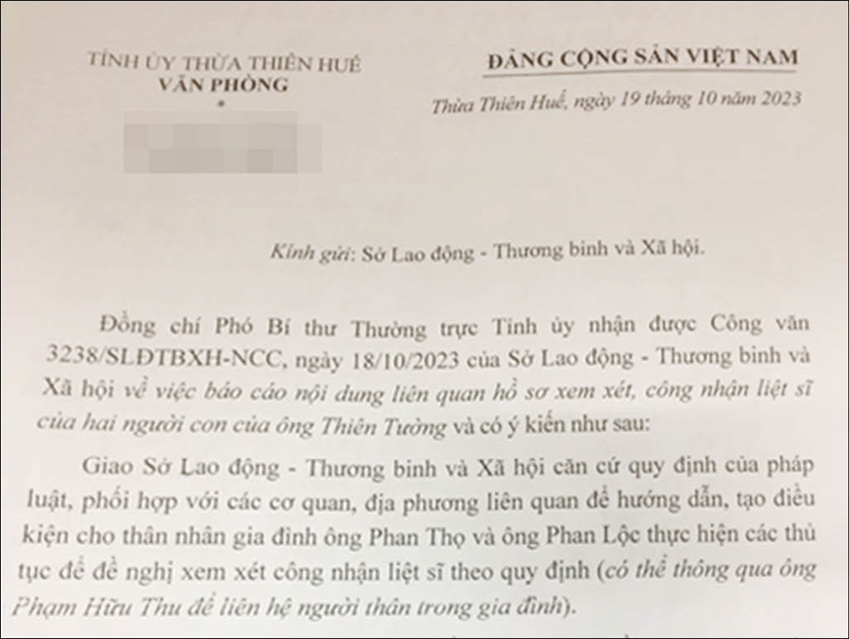 Theo đó, tại Công văn số 1194 do Phó Chánh văn phòng Tỉnh ủy Đặng Hồng Sơn ký ngày 19/10/2023 có nêu rõ: “Đồng chí Phó Bí thư Thường trực Tỉnh ủy nhận được Công văn 3238/SLĐTBXH-NCC, ngày 18/10/2023 của Sở LĐTB&XH về việc báo cáo nội dung liên quan hồ sơ xem xét, công nhận liệt sĩ của hai người con của ông Thiên Tường và có ý kiến như sau: Giao Sở LĐTB&XH căn cứ quy định của pháp luật, phối hợp với các cơ quan, địa phương liên quan để hướng dẫn, tạo điều kiện cho thân nhân gia đình ông Phan Thọ và ông Phan Lộc thực hiện các thủ tục để đề nghị xem xét công nhận liệt sĩ theo quy định (có thể thông qua ông Phạm Hữu Thu để liên hệ người thân trong gia đình)”.