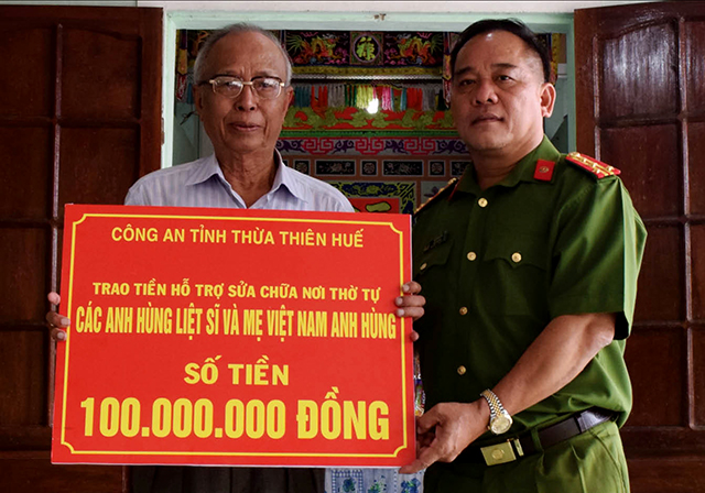 Đại tá Lê Văn Vũ trao số tiền hỗ trợ gia đình Anh hùng liệt sĩ Trần Xuân Miễn sửa chữa lại nhà thờ liệt sĩ