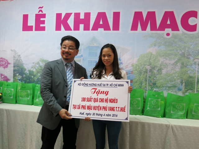 Đại diện Hội đồng hương Huế tại TP Hồ Chí Minh trao quà tượng trưng cho các hộ nghèo ở Phú Mậu, Phú Vang