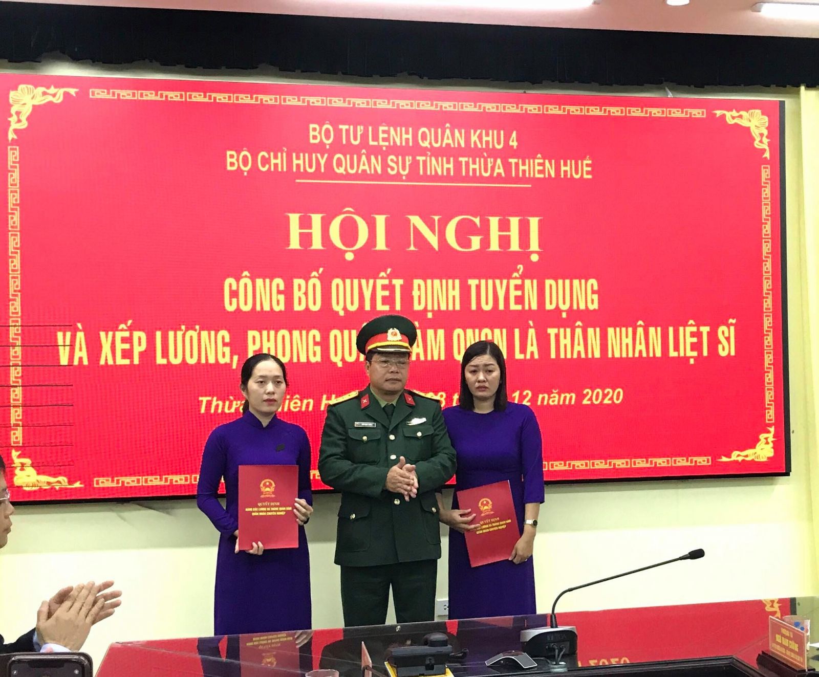 Theo đó, Bộ CHQS tỉnh trao quyết định tuyển dụng quân nhân chuyên nghiệp cho bà Hoàng Thị Hạnh Phúc (vợ liệt sĩ, thượng tá Trần Minh Hải) làm nhân viên chính sách, Phòng Chính trị, Bộ CHQS tỉnh, phiên quân hàm thượng úy quân nhân chuyên nghiệp. Bà Trương Thị Mỹ Ny (vợ liệt sĩ Nguyễn Văn Bình) được tuyển dụng làm nhân viên chính sách, Ban CHQS thị xã Hương Trà với quân hàm thượng úy quân nhân chuyên nghiệp.