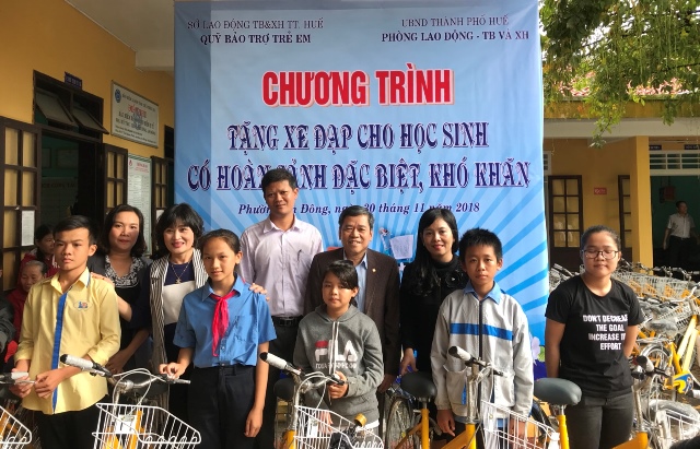 HNN.VN - Với sự hỗ trợ của Quỹ Bảo trợ trẻ em Việt Nam thông qua dự án “Hỗ trợ trẻ em lang thang và có nguy cơ bỏ học đi lang thang” năm 2018, chiều 30/11, Quỹ Bảo trợ trẻ em tỉnh phối hợp với Phòng Lao động, Thương binh và Xã hội TP. Huế tổ chức trao tặng xe đạp cho trẻ em có hoàn cảnh đặc biệt khó khăn.