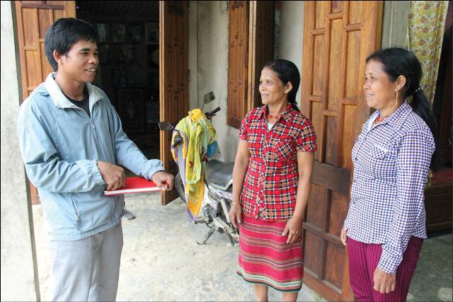 Anh Ka Rieng Hưng (trái) đến nhà người dân động viên họ tham gia các phong trào của địa phương