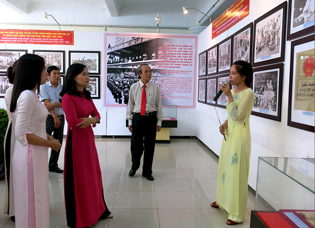 Cán bộ Bảo tàng Hồ Chí Minh giới thiệu triển lãm với người xem