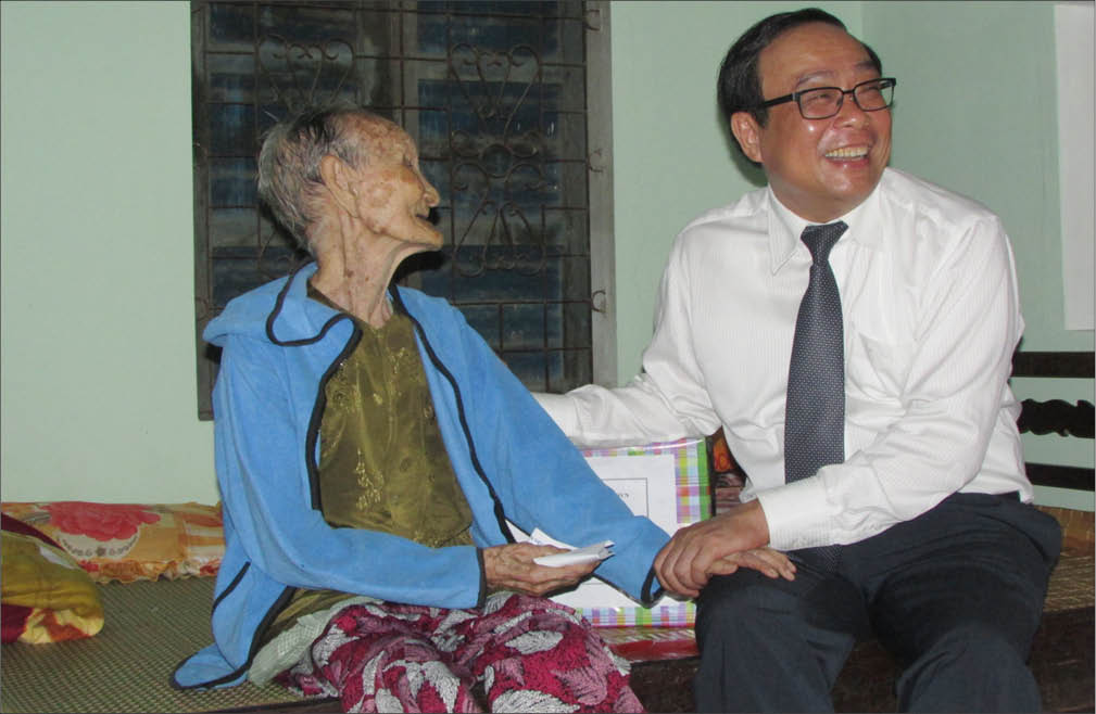 Chủ tịch HĐND tỉnh Lê Trường Lưu (trái) và lãnh đạo thị xã Hương Trà thăm hỏi Mẹ VNAH Ngô Thị Lục