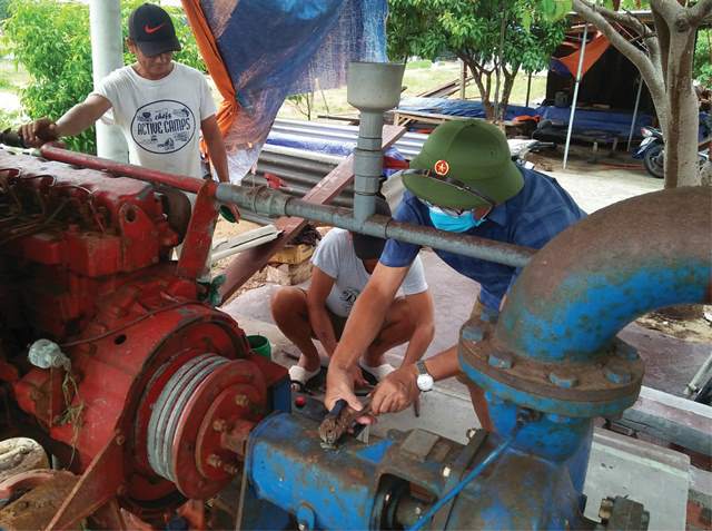 Người dân Phú Thuận tu sửa lại máy bơm công suất lớn để ứng phó mưa gây ngập úng