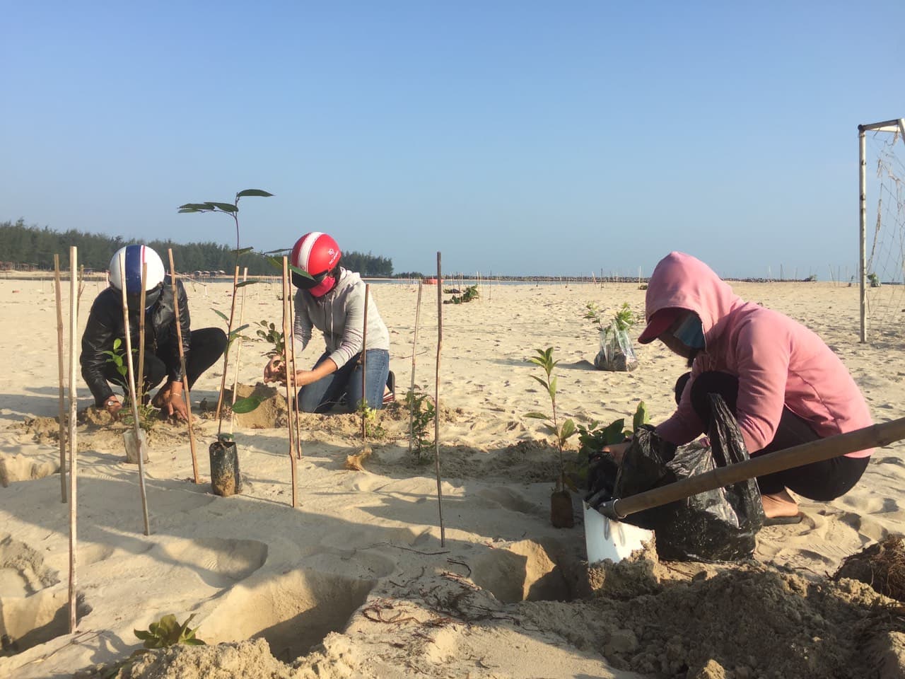 Ngay sau lễ ra quân, lực lượng tham gia đã tiến hành trồng 2.000 cây sến, cây sưng và cây mì lời trên 2ha đất bãi bồi bờ biển thôn Thai Dương Hạ Trung - khu vực này trước là vùng vịnh cũ mới được bồi cát sạch.