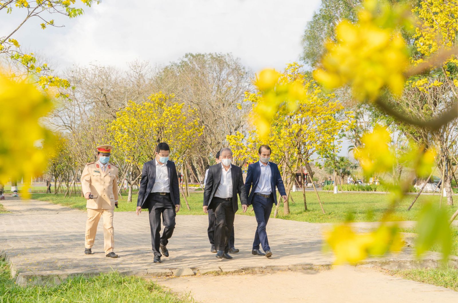 Chủ tịch UBND tỉnh Phan Ngọc Thọ (thứ hai, phải qua) cùng lãnh đạo các ban ngành thăm vườn hoàng mai trước Kinh thành Huế . Ảnh: BẢO MINH