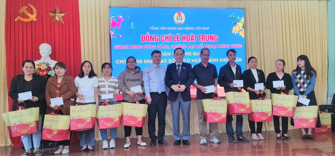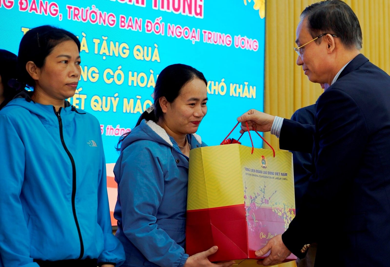 Dịp này, Trưởng ban Đối ngoại Trung ương Lê Hoài Trung và đoàn đã trao tặng 100 suất quà cho 100 đoàn viên, người lao động có hoàn cảnh khó khăn trên địa bàn tỉnh, mỗi suất trị giá 1,3 triệu đồng.