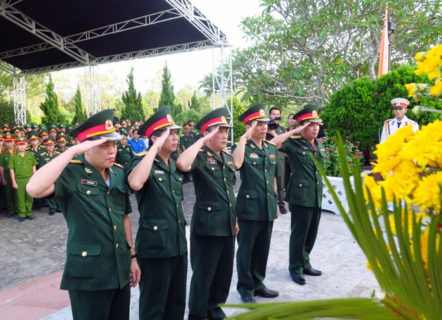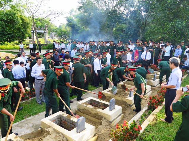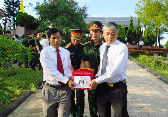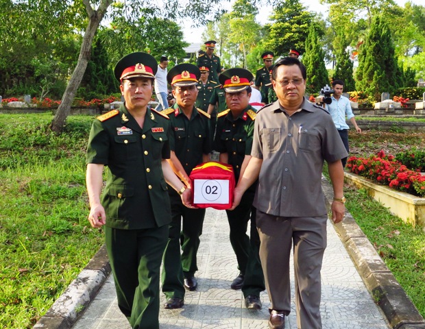 | Phó Bí thư Thường trực Tỉnh ủy Trần Thanh Bình (phải) cùng đại diện Bộ Quốc phòng đưa các liệt sĩ về nơi an nghỉ cuối cùng |