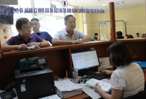 Người dân đến làm thủ tục tại bộ phận một cửa Văn phòng Đăng ký đất đai Hà Nội. Ảnh: TTXVN