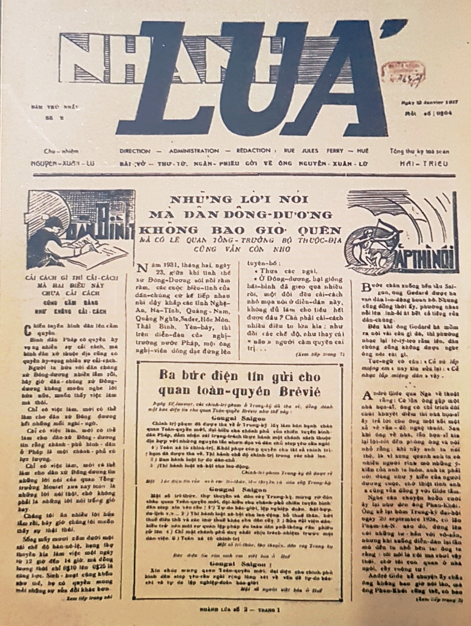 Trang nhất báo Nhành Lúa số 2. Ảnh chụp từ bản sưu tầm