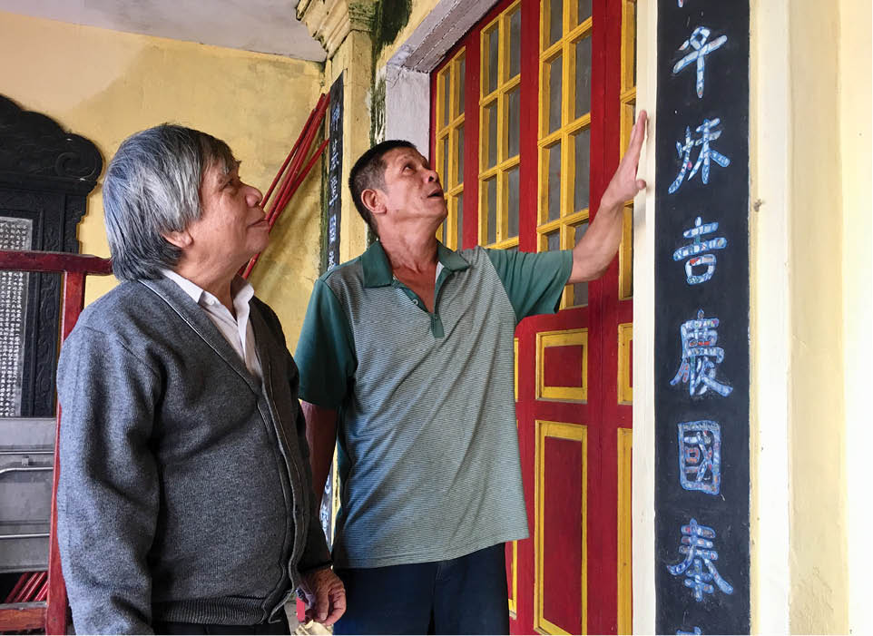 Ông Thức (bên trái) tiên phong, hết lòng bảo tồn di tích của làng