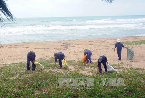 Nhân viên Công ty Môi trường đô thị tỉnh Phú Yên tổ chức thu gom rác tại bãi biển thành phố Tuy Hòa. Ảnh: Quang Quyết/TTXVN