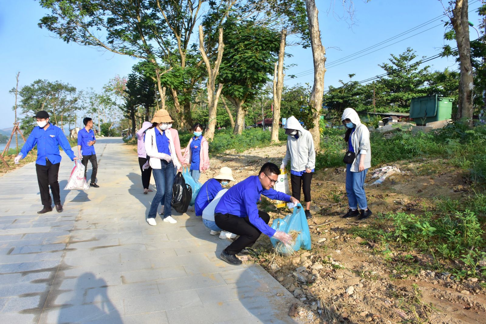 Trong buổi sáng, các đoàn viên, thanh niên Chi đoàn Văn phòng UBND tỉnh đã làm vệ sinh, nhặt rác đoạn đường đi bộ dài hơn 3km từ cầu Dã Viên đến chùa Thiên Mụ. Đây là đoạn đường dự kiến sẽ chính thức thông tuyến phục vụ người dân địa phương và du khách đến tham quan thưởng ngoạn cảnh quan sông Hương vào cuối tháng 4 này.