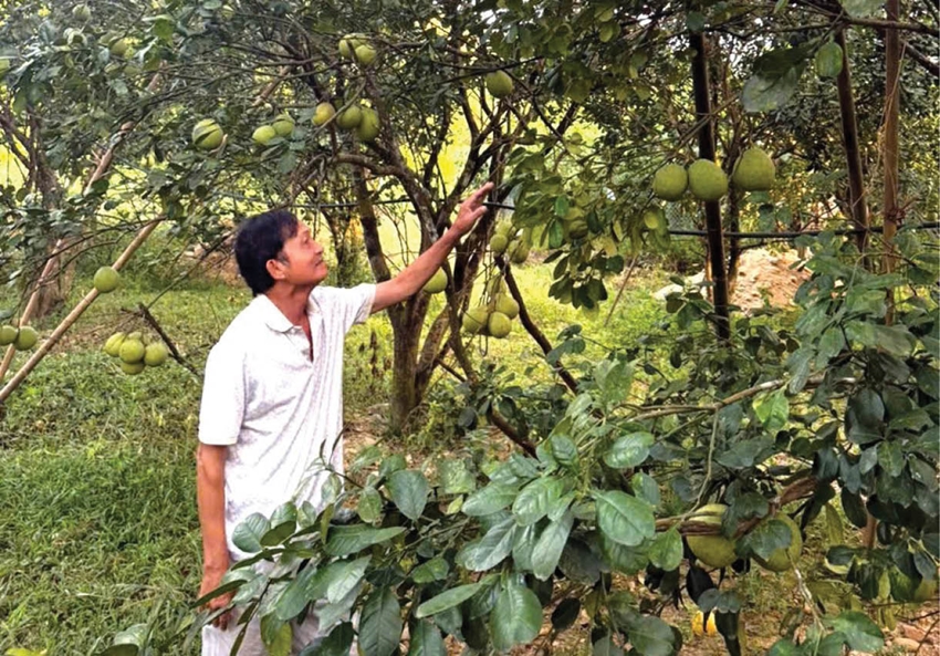 | Cựu chiến binh Lê Văn Tảo chăm sóc vườn bưởi da xanh - mô hình kinh tế hiệu quả trên vùng gò đồi |