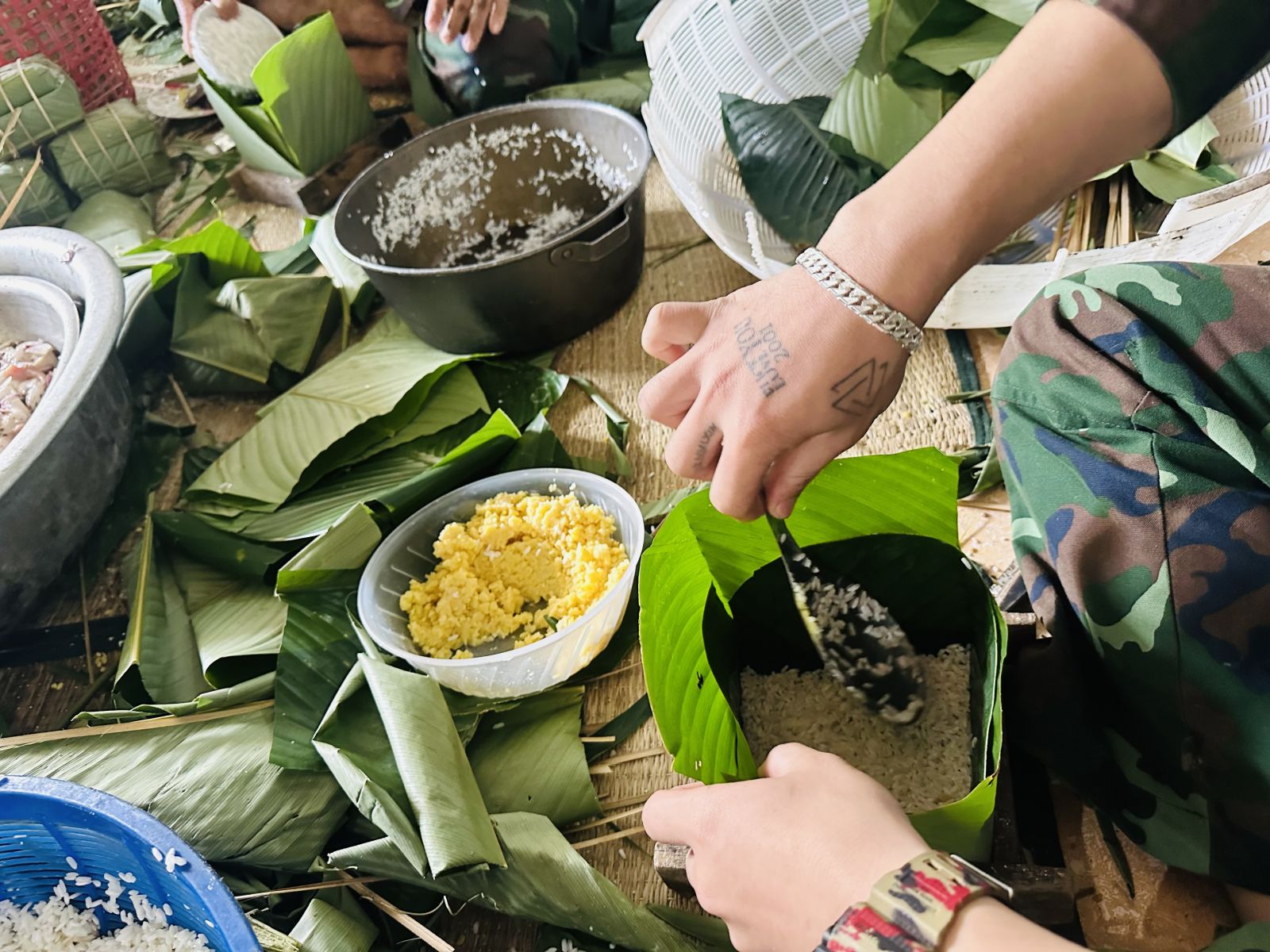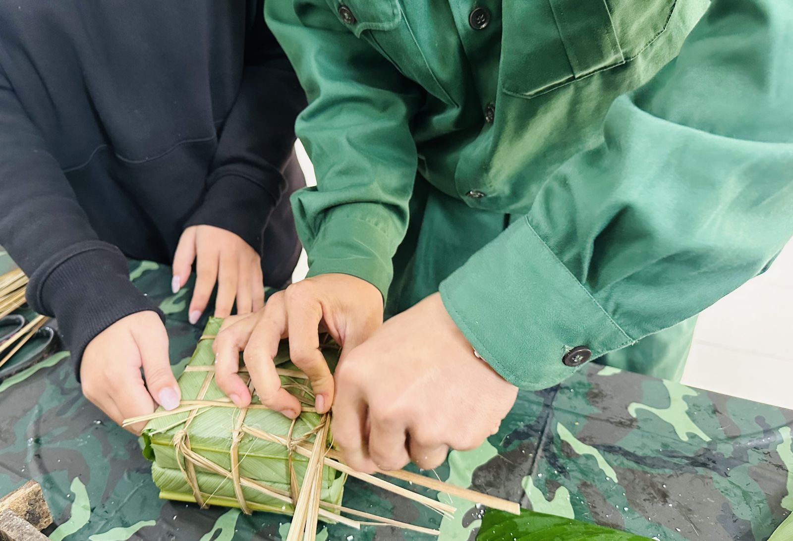 Bằng sự khéo tay, đa tài của người lính, các cán bộ chiến sĩ đã nhanh chóng hoàn thành những công đoạn gói để làm nên một chiếc bánh hoàn chỉnh. Cùng với sự hò reo, cổ vũ phía dưới của các đồng đội.