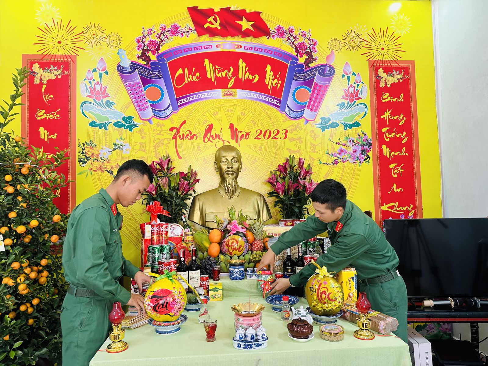 Còn chiến sĩ Lê Công Vinh thì cẩn thận, tỉ mỉ khi vinh dự được giao nhiệm vụ cùng đồng đội trang trí bàn thờ Bác Hồ: “Khi bàn thờ Bác Hồ được trang trí, bày biện xong thì không khí tết cũng đã ngập tràn đơn vị. Tết cũng khá nhiều việc, nhưng được giao nhiệm vụ chuẩn bị tết chúng em rất vui, mỗi người một việc ai cũng háo hức”, Lê Công Vinh bộc bạch.