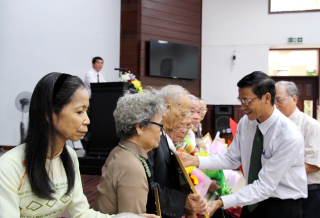 Phó Bí thư Thường trực Thành ủy Huế Nguyễn Xuân Hòa trao tặng Huy hiệu 70 năm tuổi Đảng cho các đảng viên