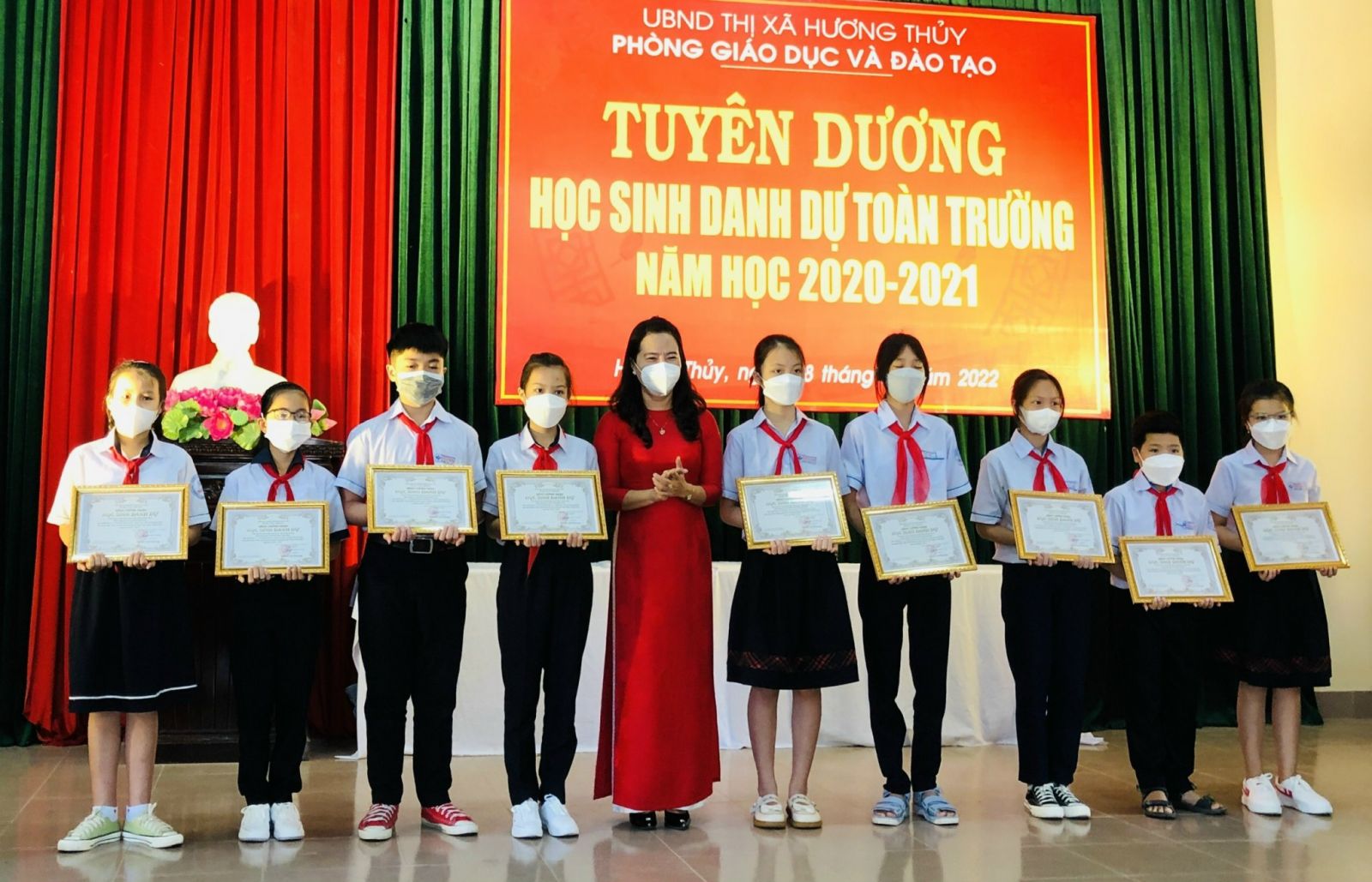 Năm học 2020 – 2021, TX. Hương Thủy có 26 học sinh tiêu biểu của 16 trường tiểu học và 10 trường trung học cơ sở vinh dự được nhận danh hiệu “Học sinh danh dự toàn trường” cùng phần thưởng 1 triệu đồng/học sinh.