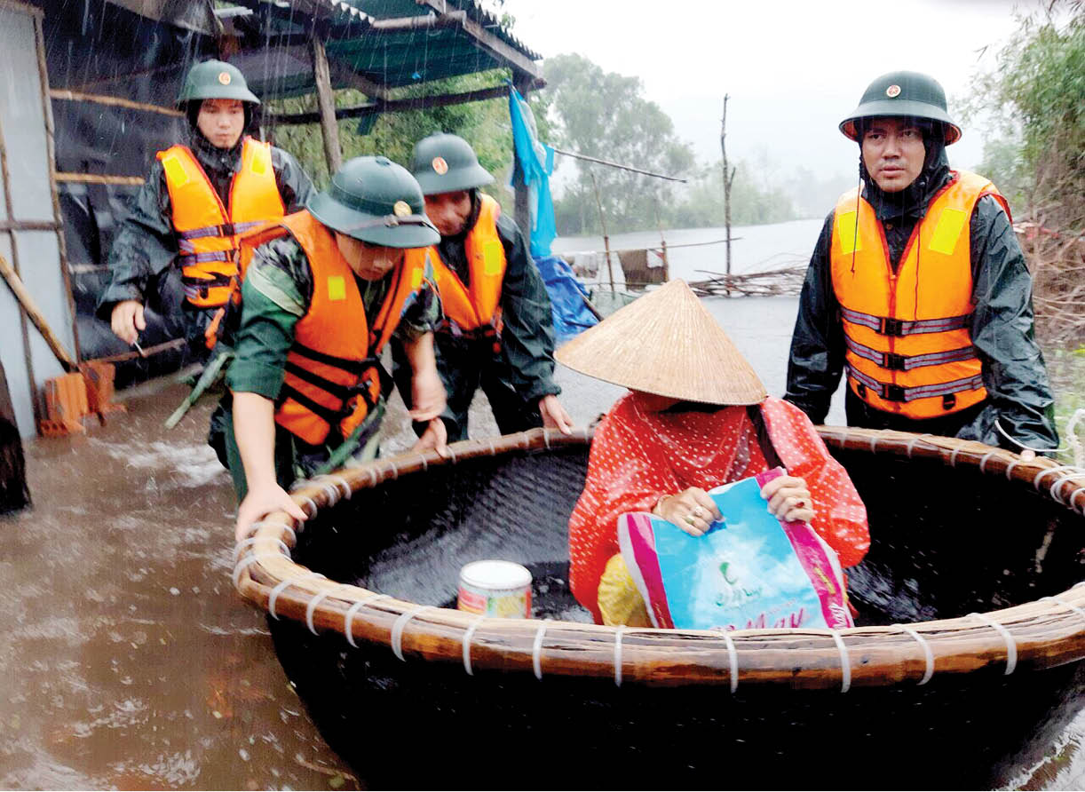 Cán bộ, chiến sĩ Đồn Biên phòng Vinh Hiền giúp nhân dân di dời đến nơi an toàn trong đợt mưa lũ năm 2020
