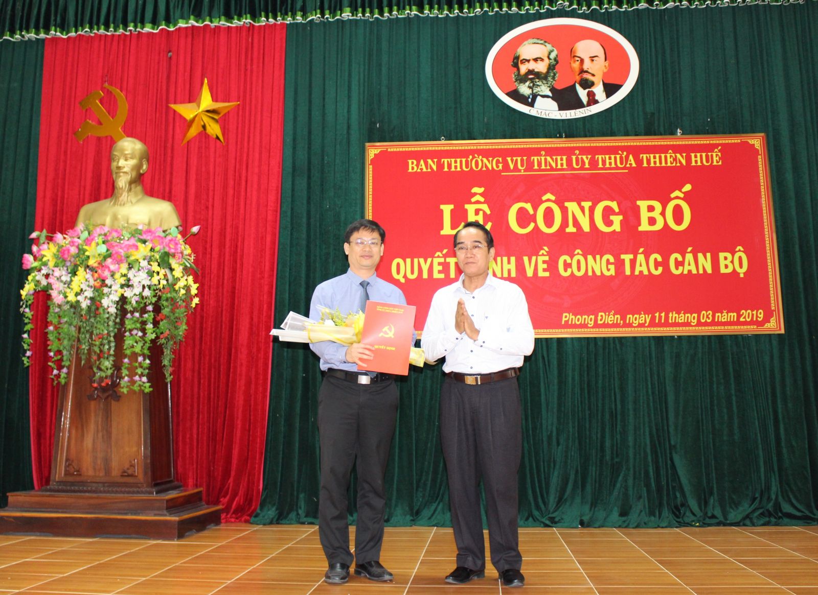 Tại buổi lễ, đồng chí Đoàn Thị Thanh Huyền, UVTV, Trưởng Ban Tổ chức Tỉnh ủy đã công bố Quyết định 1816-QĐ/TU của Ban Thường vụ Tỉnh ủy về việc điều động ông Nguyễn Thanh Bình, TUV, Chánh văn phòng Tỉnh ủy đến nhận công tác tại Huyện ủy Phong Điền và chỉ định tham gia Ban Chấp hành Đảng bộ, Ủy viên Ban Thường vụ Huyện ủy, giữ chức vụ Bí thư Huyện ủy Phong Điền nhiệm kỳ 2015 - 2020.