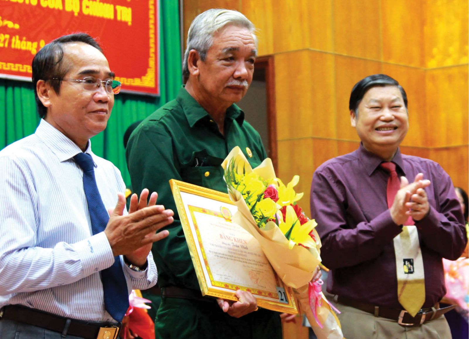 Ông Nguyễn Văn Diệu (giữa) được nhận Bằng khen của Ban Thường vụ Tỉnh ủy về học Bác