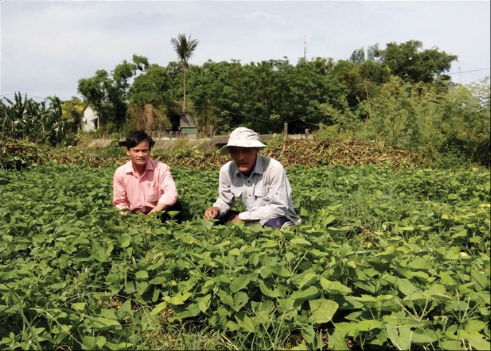 Phó Chủ tịch UBND xã Phú Mậu Nguyễn Văn Trai (bên trái) cùng dân theo dõi sự phát triển của các loại rau màu