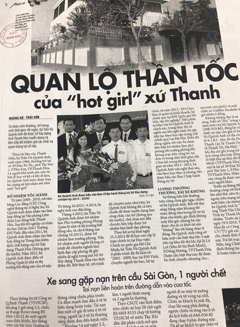 Lần đầu đăng trên báo Thanh Niên, tác phẩm “Quan lộ thần tốc của “hot girl” xứ Thanh” đã gây bức xúc trong dư luận xã hội về trường hợp bà Trần Vũ Quỳnh Anh từ nhân viên tạp vụ, chỉ trong một thời gian ngắn đã được sở Xây dựng tỉnh Thanh Hóa tuyển dụng và liên tiếp bổ nhiệm giữ các chức vụ quan trọng tại Sở này.