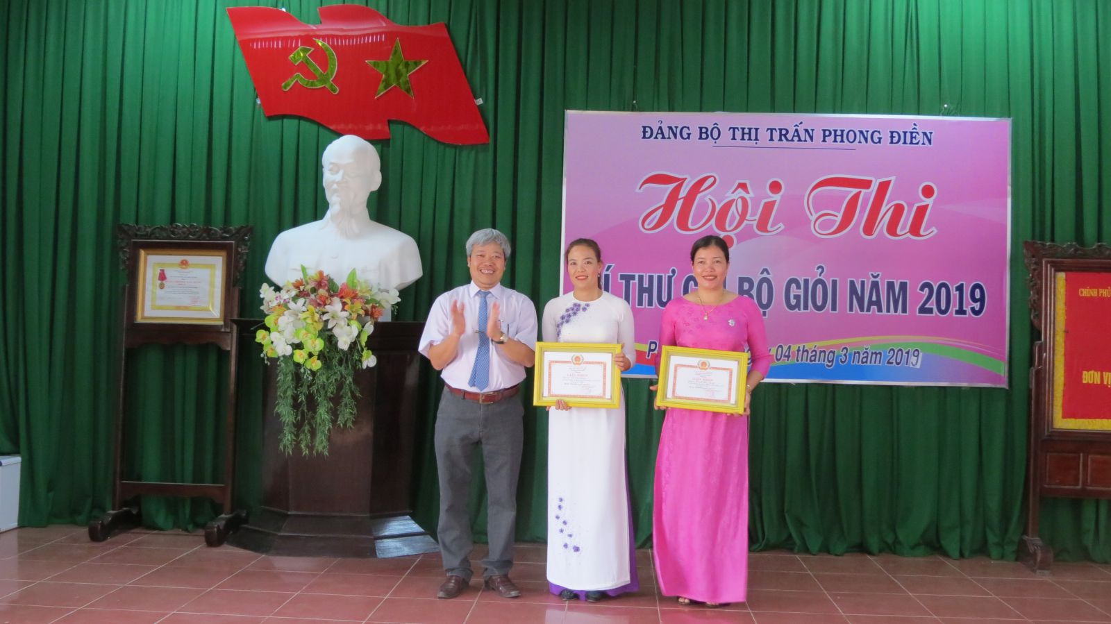 Ông Lê Thành Bắc, Bí thư Đảng ủy thị trấn Phong Điền trao giải Nhất cho bà Lê Thị Thủy, Bí thư Chi bộ Trường tiểu học Trần Quốc Toản và bà Trịnh Thị Oanh, Bí thư Chi bộ Trường mần non Hoa Sen