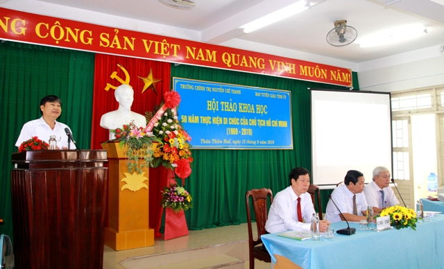 Phát biểu tại hội thảo, Trưởng ban Tuyên giáo Tỉnh ủy Nguyễn Thái Sơn chỉ đạo: “Đây là hội thảo khoa học thứ 3 trong toàn tỉnh liên quan đến 50 năm thực hiện Di chúc của Chủ tịch Hồ Chí Minh. Qua hội thảo, mong rằng đội ngũ cán bộ lãnh đạo, giảng dạy của Trường Chính trị Nguyễn Chí Thanh ra sức phấn đấu thực hiện tâm nguyện của Người, noi gương Người; ứng dụng vào công tác giảng dạy, đào tạo, bồi dưỡng đội ngũ cán bộ đáp ứng yêu cầu mới mà Bác Hồ kính yêu đã căn dặn”.