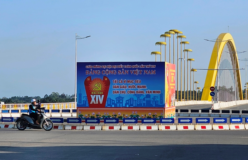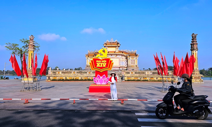 Bạn trẻ Huế đến chụp ảnh ở các điểm trang trí chào mừng Đại hội đại biểu toàn quốc lần thứ XIV của Đảng