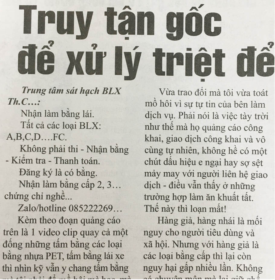 Để thực hiện bài viết ấy, tôi đã thử kết nối đóng vai là người cần một cái bằng lái ô tô hạng C. Giá được đối tượng đưa ra là 4,5 triệu đồng bao trọn gói. Tỏ ra hơi phân vân về độ an toàn của “sản phẩm”, tôi lập tức được đối tượng trấn an, nào là: “ Bằng lái xe chuẩn tem phôi hồ sơ và dấu mộc đỏ; Được cấp QR đầy đủ, chỉ cần quét trên ap QR là sẽ lên đầy đủ thông tin chính chủ; Bằng lưu hành xuất trình cho CSGT kiểm tra thoải mái nên anh chị yên tâm khi sử dụng và lưu thông; Bằng làm chủ yếu cho CSGT kiểm tra nên có đầy đủ thông tin mã QR của Bộ và điều kiện lưu hành. Bên em đã làm rất nhiều cho hội anh em lái xe, gặp CSGT thoải mái kiểm tra hàng ngày mà…”. Đối tượng còn cho thêm số điện thoại liên lạc để nếu quyết định làm thì liên hệ... Vừa trao đổi mà tôi vừa toát mồ hôi vì sự tự tin của bên làm dịch vụ. Phải nói là việc tày trời như thế mà họ quảng cáo công khai, giao dịch công khai và vô cùng tự nhiên, không hề có một chút dấu hiệu e ngại hay sợ sệt (…).
