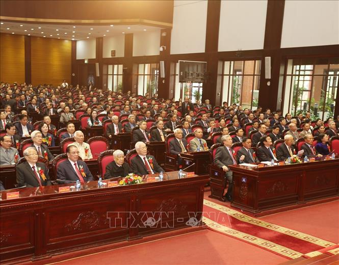 Tổng Bí thư Nguyễn Phú Trọng cùng nhiều đồng chí lãnh đạo, nguyên lãnh đạo cấp cao của Đảng, Nhà nước dự Lễ kỷ niệm. Ảnh: Trí Dũng/TTXVN